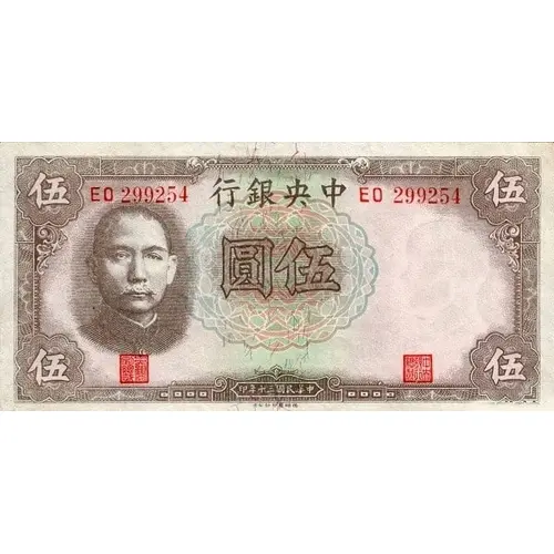 | Obverse lettering | 行銀央中 圓伍 (Translation: Central Bank of China Five Yuan) |