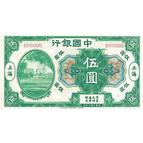| Reverse lettering | Bank Of China Promises to Pay the Bearer on Demand at its Office Here Five Dollars Local Currency September 1918 Shanghai American Bank Note Company |