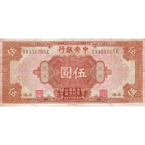 | Reverse lettering | THE CENTRAL BANK OF CHINA PROMISES TO PAY THE BEARER ON DEMAND AT ITS OFFICE HERE FIVE DOLLARS NATIONAL CURRENCY. SHANGHAI 1928 AMERICAN BANK NOTE COMPANY. |