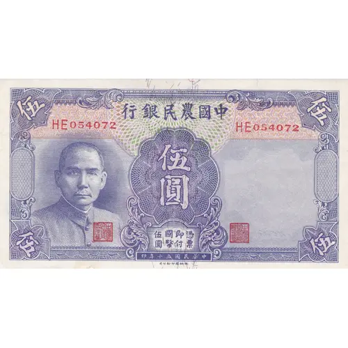 行銀民農國中 伍 圓 伍國即憑 圓幣付票 印年十三國民華中 司公鈔印羅納德 (Translation: The Farmers Bank of China 5 Yuan Pay for national currency 5 yuan by note Printed in the 30th year of the Republic of China Thomas De La Rue & Company Limited London) |