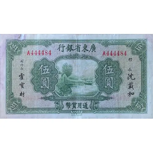 | Legenda awersu | 廣東省銀行 伍圓 通用貨幣 中華書局有限公司 (Translation: Kwangtung Provincial Bank 5 Yuan (5 Dollars) Circulate Currency Chun Hwa Book Co. Ltd.) |
