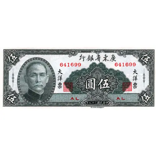 | Obverse lettering | 廣東省銀行 大洋票 伍圓 中華民國三十八年 中華書局股份有限公司 |