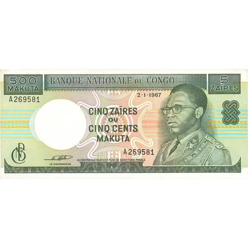 (Translation: NATIONAL BANK OF CONGO FIVE ZAIRES OR FIVE HUNDRED MAKUTA)