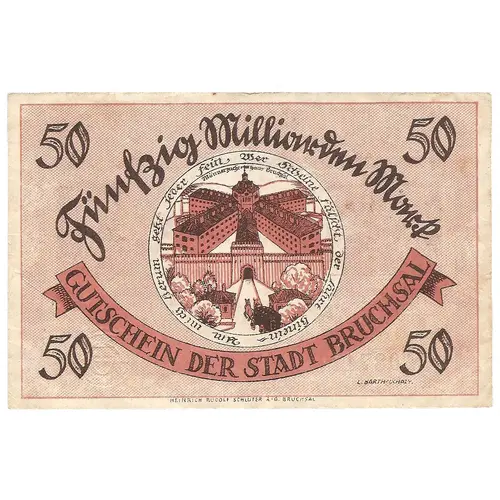 DIESER SCHEIN WIRD AUSSER BEI DEN STADT KASSEN BEI ALLEN HIESIGEN BANKEN IN ZAHLUNG GENOMMEN UND NACH AUFRUF IN DEN BRUCHALER TAGESZEITUNGEN EINGELOST. BRUCHSAL DEN 1. november 1923 |