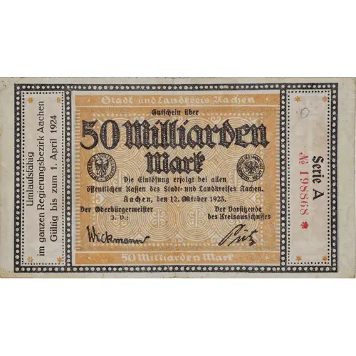 Umlaufsfähig im ganzen Regierungsbezirk Aachen Gültig bis zum 1. April 1924 Stadt und Landkreis Aachen Gutschein über 50 Milliarden Mark Die Einlösung erfolgt bei allen öffentlichen Kassen des Stadt und Landkreisses Aachen Aachen, den 12. Oktober 1923. Der Oberbürgermeister Der Vorsitzende des Kreisausschusses |