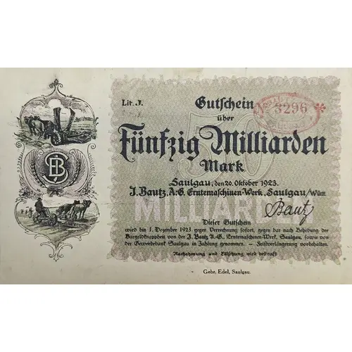 | Obverse lettering | Gutschein über Fünfzig Milliarden Mark Saulgau, den 20. Oktober 1923. J. Bautz, A.-G. Erntemaschinen-Werk, Saulgau/Württ. Dieser Gutschein wird bis 1. Dezember 1923 gegen Verrechnung sofort, gegen bar nach Behebung der Bargeldknappheit von der J. Bautz A.-G., Erntemaschinen-Werk, Saulgau, sowie von der Gewerbebank Saulgau in Zahlung genommen. - Fristverlängerung vorbehalten. |