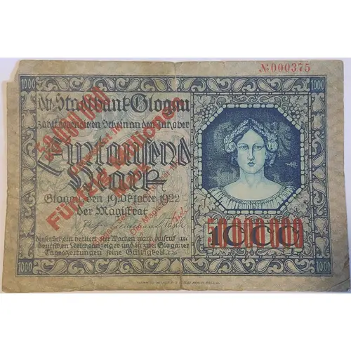 | Obverse description | Overprint on a Glougau 1000 Mark of 19 October 1919 |