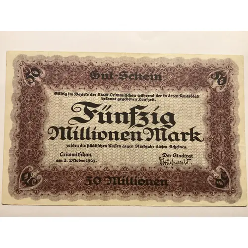 Gut=Schein 50 Millionen Gültig Gimena Bezirke der Stadt Crimmitschau wahrend der in deren Amtsblatt bekannt gegebenen Laufzeit FÜNFZIG MILLIONEN MARK Zahlen die Stadtischen Kassen gegen Rückgabe dieses Scheines Crimmitschau,am 2.Oktober 1923. Der Stadtrat |