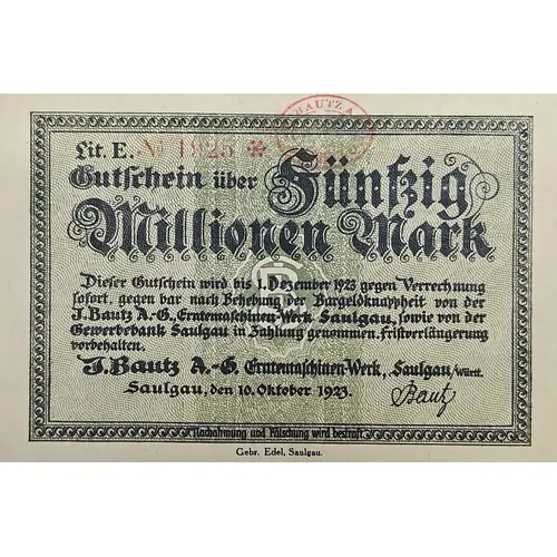 | نوشتههای روی اسکناس | Gutschein über fünfzig Millionen Mark Dieser Gutschein wird bis 1. Dezember 1923 gegen Verrechnung sofort, gegen bar nach Behebung der Bargeldknappheit von der J. Bautz A.-G., Erntemaschinen-Werk Saulgau, sowie von der Gewerbebank Saulgau in Zahlung genommen. Fristverlängerung vorbehalten. J. Bautz A. G. Erntemaschinen-Werk, Saulgau/Württ. Saulgau, den 10. Oktober 1923 |