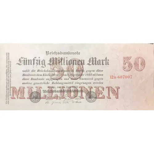 | Obverse lettering | Reichsbanknote Fünfzig Millionen Mark zahlt die Reichsbankhauptkasse in Berlin gegen diese Banknote dem Einlieferer. Vom 1. September 1923 ab kann diese Banknote aufgerufen und unter Umtausch gegen andere gesetzliche Zahlungsmittel eingezogen werden Berlin, den 25. Juli 1923 Reichsbankdirektorium |