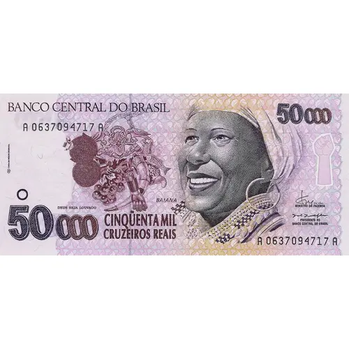 | Obverse lettering | BANCO CENTRAL DO BRASIL 50 000 CASA DA MOEDA DO BRASIL BAIANA DEUS SEJA LOUVADO MINISTRO DA FAZENDA PRESIDENTE DO BANCO CENTRAL DO BRASIL 50 000 CINQÜENTA MIL CRUZEIROS REAIS (Translation: 50 000 Central Bank of Brazil Brazilian Mint Baiana God be praised Finance Minister President of the Central Bank of Brazil Fifty Thousand Cruzeiros Reais) |