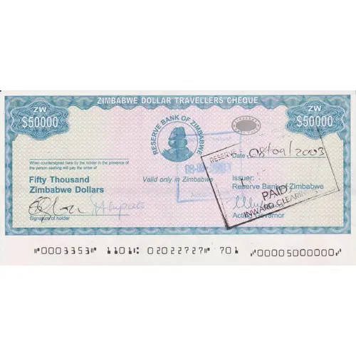 ZIMBABWE DOLLAR TRAVELLERS CHEQUE RESERVE BANK OF ZIMBABWE When countersigned here by the holder in the presence of the person cashing will pay the order of Fifty Thousand Zimbabwe Dollars Signature of the holder Valid only in Zimbabwe Issuer: Reserve Bank of Zimbabwe Acting Governor |