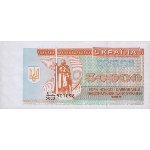 УКРАЇНА КУПОН 50000 УКРАЇНСЬКИХ КАРБОВАНЦІВ НАЦІОНАЛЬНИЙ БАНК УКРАЇНИ 1993 (Translation: UKRAINE COUPON 50000 UKRAINIAN KARBOVANTSIV NATIONAL BANK OF UKRAINE 1993) |