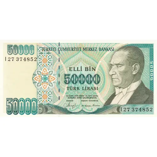 | Obverse lettering | TÜRKİYE CÜMHURİYET MERKEZ BANKASI ELLİ BİN 50000 TÜRK LİRASI 14 OCAK 1970 TARİH VE 1211 SAYILI KANUNA GÖRE ÇIKARILMIŞTIR (Translation: Central Bank of the Republic of Turkey, Fifty Thousand Turkish Lira, Issued according to the law number 1211 of 14 January 1970) |