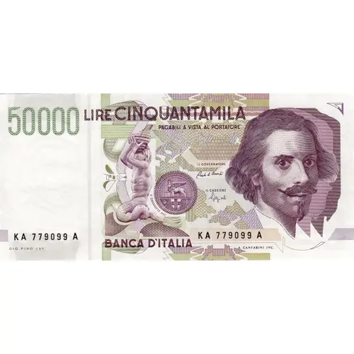 50000 LIRE CINQUANTAMILA PAGABILI A VISTA AL PORTATORE IL GOVERNATORE IL CASSIERE F. ZANNOTTI INC. BANCA D`ITALIA GIO. PINO INV. A. CANFARINI INC. |