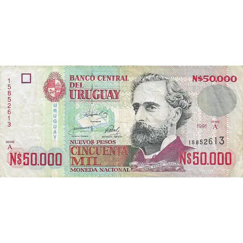 | Obverse lettering | BANCO CENTRAL DEL URUGUAY NUEVOS PESOS CINCUENTA MIL MONEDA NACIONAL (Translation: Central Bank of Uruguay Nuevos Pesos Fifty Thousand National currency) |