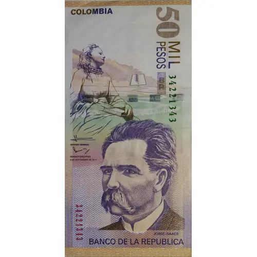| Obverse lettering | COLOMBIA SANTA FE DE BOGOTA 7 DE AGOSTO DE 2000 JORGE ISAACS BANCO DE LA REPUBLICA 50 MIL PESOS (Translation: Colombia Santa Fe de Bogota August 7th., 2000 Jorge Isaacs Bank of the Republic 50 thousand Pesos) |
