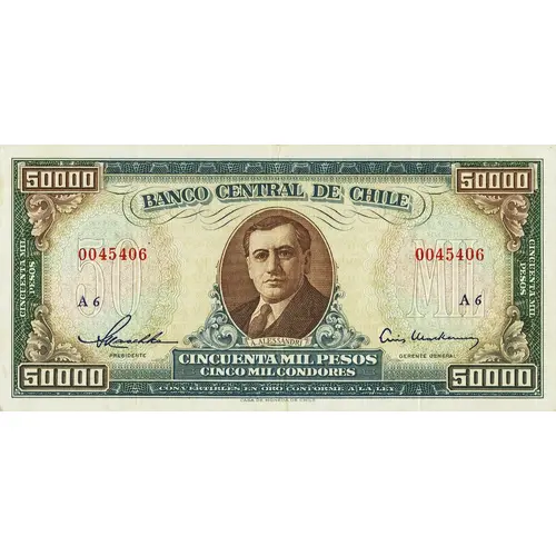 | Opis líce | BANCO CENTRAL DE CHILE CINCUENTA MIL PESOS CINCO MIL CONDORES CONVERTIBLES EN ORO CONFORME A LA LEY CASA DE MONEDA DE CHILE (Translation: Central Bank of Chile Fifty Thousand Pesos Five Thousand Condores Convertible on gold, according to the Law Chile Mint) |