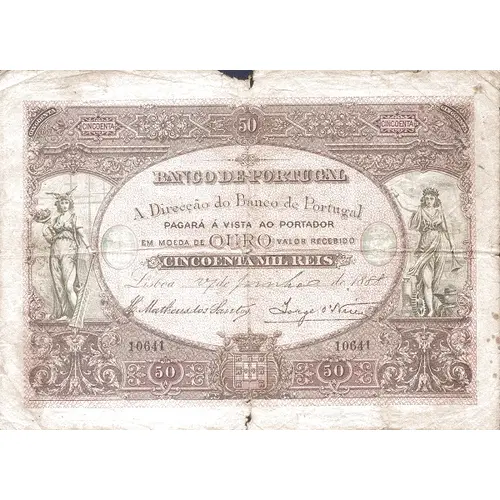 | Obverse lettering | 50 BANCO DE PORTUGAL A Direcção do Banco de Portugal Pagará à vista ao portador e moeda de OURO valor recebido CINCOENTA MIL RÉIS Lisboa, 17 de Junho de 1889. (Translation: Bank of Portugal The Management of the Bank of Portugal Will pay in cash to the bearer and GOLD coin amount received Fifty Thousand Reis Lisbon, June 17, 1889) |