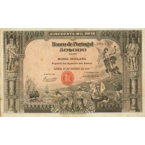 | Obverse lettering | CINCOENTA MIL RÉIS BANCO DE PORTUGAL 50$000 OURO MOEDA INSULANA Pagavel nas agencias nos Açôres LISBOA 30 DE JANEIRO DE 1905 ESTAMPARÍA DO BANCO DE PORTUGAL (Translation: Fifty Thousand Reis Bank of Portugal Gold Island currency Payable at agencies in the Azores Lisbon, January 30, 1905 Printer of Bank of Portugal) |