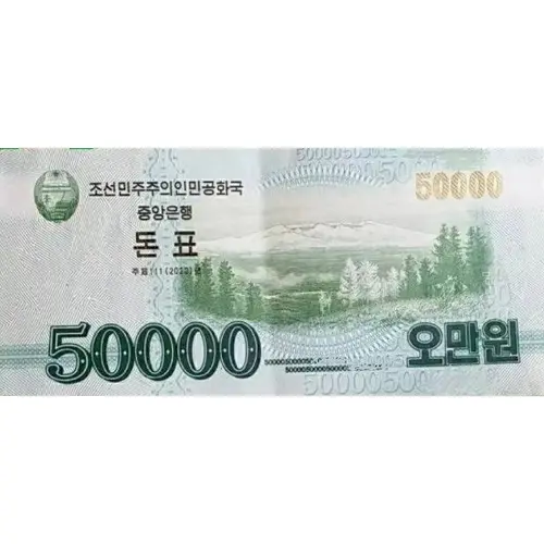 | Opis líce | 조선민주주의인민공화국 중앙은행 돈표 주체111 (2022) 50000 오만원 (Translation: Central Bank of the Democratic People`s Republic of Korea, Money coupon, Fifty Thousand Won) |