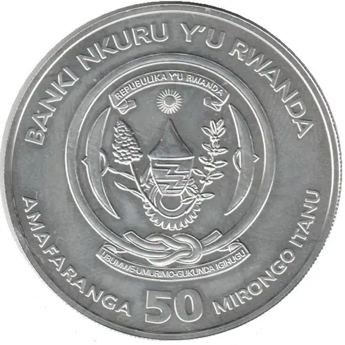 | 正面铭文 | BANKI NKURU Y`U RWANDA REPUBLIKA Y`U RWANDA UBUMWI - UMURIMO - GUKUNDA IGIHUGU AMAFARANGA 50 MIRONGO ITANU (Translation: Central Bank of Rwanda. Republic of Rwanda. Unity work patriotism. Fifty francs.) |