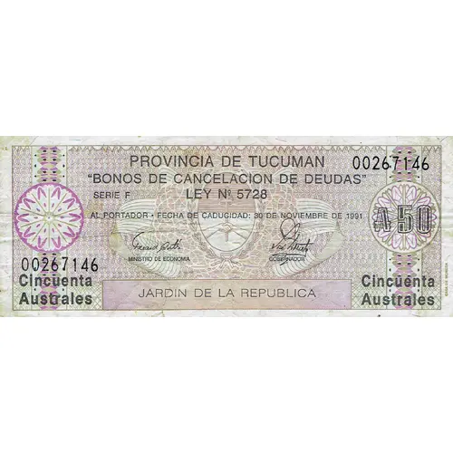 PROVINCIA DE TUCUMAN `BONOS DE CANCELACION DE DEUDAS` SERIE F LEY N 5728 AL PORTADOR FECHA DE CADUCIDAD 30 DE NOVIEMBRE DE 1991 MINISTRO DE ECONOMIA GOBERNADOR JARDIN DE LA REPUBLICA (Translation: TUCUMAN PROVINCE `DEBT CANCELLATION BONDS` SERIES F LAW N 5728 TO THE CARRIER DATE OF EXPIRY NOVEMBER 30, 1991 ECONOMY MINISTER GOVERNOR GARDEN OF THE REPUBLIC) |