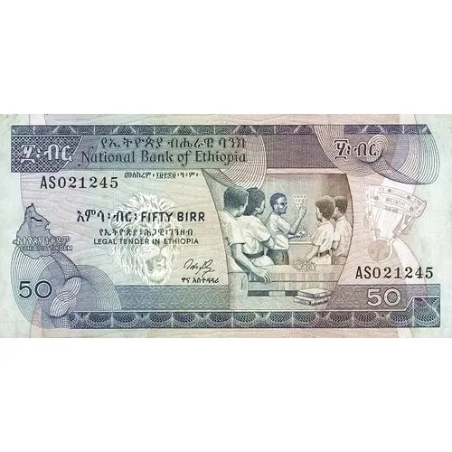 | 表面の銘文 | ፶፡ብር የኢትዮጵያ ብሔራዊ ባንክ National Bank of Ethiopia መስከረም፡፲፱፻፷፱፡ዓ፡ም፡ አምሳ፡ብር፡ FIFTY BIRR የኢትዮጵያ፡ሕጋዊ፡ገንዘብ LEGAL TENDER IN ETHIOPIA ኢትዮጵያ ትቅደም ETHIOPIA TIKDEM 50 (Translation: 50 Birr National Bank of Ethiopia September 1969 A.M. Fifty Birr Legal Tender in Ethiopia Ethiopia First) |