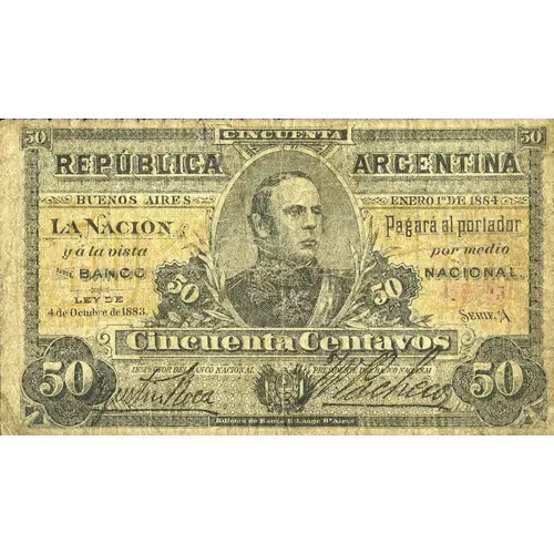 CINCUENTA REPÚBLICA ARGENTINA BUENOS AIRES ENERO 1º DE 1884 LA NACION Pagará al portador y á la vista por medio del BANCO NACIONAL LEY DE 4 de Octubre de 1883 Cincuenta Centavos Billetes de Banco B. Lange B. Aires (Translation: Fifty Republic Argentina Buenos Ayres January 1st., 1884 The Nation will pay to the bearer and in sight through the National Bank Fifty Cents Law of October 4, 1883) |