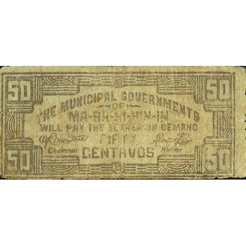 | Obverse lettering | THE MUNICIPAL GOVERNMENTS OF MA-BA-HI-HIN-IN WILL PAY THE BEARER ON DEMAND FIFTY CENTAVOS |