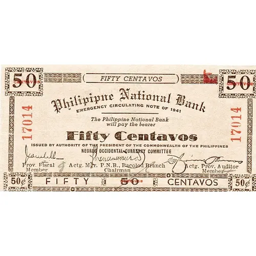 | Obverse lettering | FIFTY CENTAVOS PHILIPPINE NATIONAL BANK EMERGENCY CIRCULATING NOTE OF 1941 THE PHILIPPINE NATIONAL BANK WILL PAY THE BEARER FIFTY CENTAVOS ISSUED BY AUTHORITY OF THE PRESIDENT OF THE COMMONWEALTH OF THE PHILIPPINES NEGROS OCCIDENTAL CURRENCY COMMITTEE FIFTY CENTAVOS |