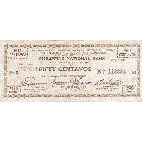| Obverse lettering | THE MISAMIS OCCIDENTAL AGENCY OF THE PHILIPPINE NATIONAL BANK WILL PAY TO THE BEARER ON DEMAND THE AMOUNT OF THIS PHILIPPINE NATIONAL BANK EMERGENCY CIRCULATING NOTE FIFTY CENTAVOS ISSUED BY THE MISSAMIS OCCIDENTAL CURRENCY COMMITTEE |