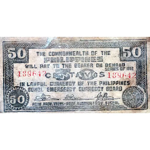 | Legenda rewersu | ISSUED BY THE BOHOL EMERGENCY CURRENCY BOARD BY AUTHORITY OF THE PRESIDENT OF THE PHILIPPINES FIFTY CENTAVOS |