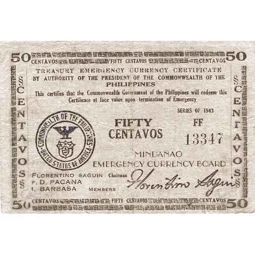 | Obverse lettering | FIFTY CENTAVOS TREASURY EMERGENCY CURRENCY CERTIFICATE BY AUTHORITY OF THE PRESIDENT OF THE COMMONWEALTH OF THE PHILIPPINES THIS CERTIFIES THAT THE COMMONWEALTH GOVERNMENT OF THE PHILIPPINES WILL REDEEM THIS CERTIFICATE AT FACE VALUE UPON TERMINATION OF EMERGENCY FIFTY CENTAVOS MINDANAO EMERGENCY CURRENCY BOARD FIFTY CENTAVOS |