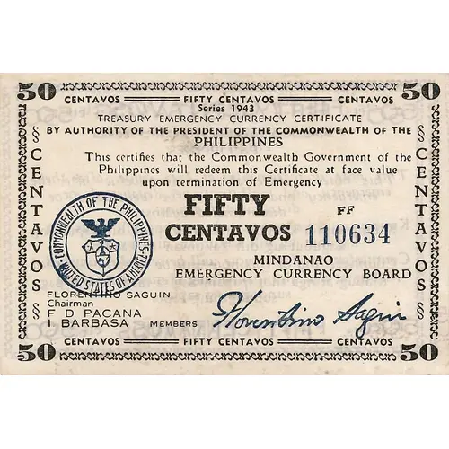 FIFTY CENTAVOS TREASURY EMERGENCY CURRENCY CERTIFICATE BY AUTHORITY OF THE PRESIDENT OF THE COMMONWEALTH OF THE PHILIPPINES THIS CERTIFIES THAT THE COMMONWEALTH GOVERNMENT OF THE PHILIPPINES WILL REDEEM THIS CERTIFICATE AT FACE VALUE UPON TERMINATION OF EMERGENCY SERIES 1944 FIFTY CENTAVOS MINDANAO EMERGENCY CURRENCY BOARD FIFTY CENTAVOS |