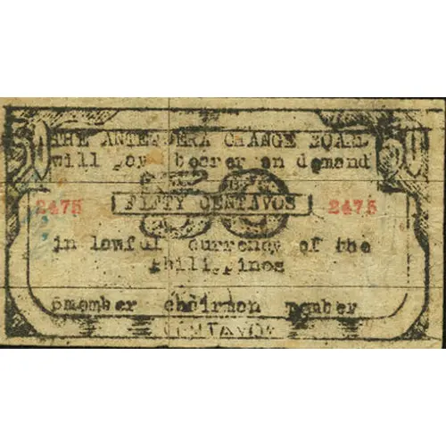 | Legenda do anverso | THE ANTEQUERA CHANGE BOARD WILL PAY THE BEARER ON DEMAND 50 FIFTY CENTAVOS IN LAWFUL CURRENCY OF THE PHILIPPINES |