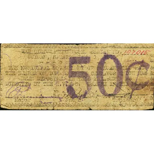 | Obverse lettering | WAR CIRCULATING NOTE GUIUAN, SAMAR THE MUNICIPAL GOVERNMENT OF GUIUAN WILL PAY THE BEARER ON DEMAND FIFTY CENTAVOS WICH HAS BEEN DEPOSITED IN THE TREASURY AS INSTRUCTED BY THE M.V.S.C. USAFFE IN THE FIELD 50 ¢ |