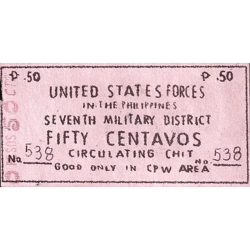 | Obverse lettering | UNITED STATES FORCES IN THE PHILIPPINES SEVENTH MILITARY DISTRICT FIFTY CENTAVOS CIRCULATING CHIT GOOD ONLY IN CPW AREA |