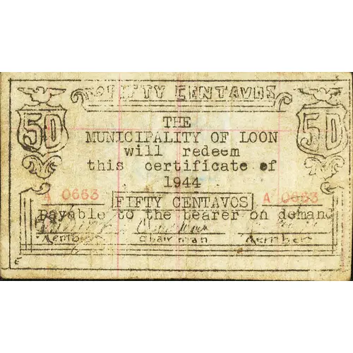 | Obverse lettering | FIFTY CENTAVOS THE MUNICIPALITY OF LOON WIL REDEEM THIS CERTIFICATE OF 1944 FIFTY CENTAVOS PAYABLE TO THE BEARER ON DEMAND |