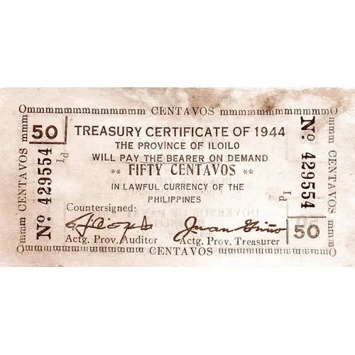 Obverse lettering 50 CENTAVOS TREASURY CERTIFICATE OF 1944 THE PROVINCE OF ILOILO WILL PAY THE BEARER ON DEMAND FIFTY CENTAVOS IN LAWFUL CURRENCY OF THE PHILIPPINES
