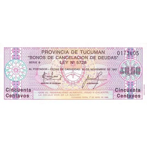 PROVINCIA DE TUCUMAN `BONOS DE CANCELACION DE DEUDAS` SERIE A LEY No 5728 AL PORTADOR . FECHA DE CADUCIDAD: 30 DE NOVIEMBRE DE 1987 Diez Centavos `QUE EL FEDERALISMO ALIMENTE, ROJO Y CALIENTE, LA CELULA VIVA DE LA NACION`, FERNANDO RIERA, 1° de ABRIL DE 1985 Diez Centavos (Translation: TUCUMAN PROVINCE `DEBTS CANCELLATION BONDS` SERIES A LAW No. 5728 TO THE CARRIER . EXPIRATION DATE: NOVEMBER 30, 1987 Ten cents `MAY FEDERALISM FEED, RED AND HOT, THE LIVING CELL OF THE NATION`, FERNANDO RIERA, APRIL 1, 1985 Ten cents) |