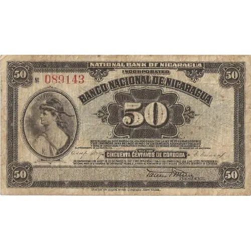 | Opis líce | NATIONAL BANK OF NICARAGUA INCORPORATED BANCO NACIONAL DE NICARAGUA 50 ESTE BILLETE HA SIDO EMITIDO DE CONFORMIDAD COM LA LEY DE 20 DE MARZO DE 1912 Y SUS ENMIENDAS. SERA RECIBIDO EN PAGO DE LOS DERECHOS ADUANEROS Y FISCALES Y SERÁ DE CURSO LEGAL Y OBLIGATORIO PARA EL PAGO DE DEUDAS DENTRO DE LA REPUBLICA. VALE POR CINCUENTA CENTAVOS DE CÓRDOBA DE CONFORMIDAD CON LA LEY DE 20 DE MARZO DE 1912 Y SUS ENMIENDAS Y BAJO LAS CONDICIONES QUE ESAS LEYES PRESCRIBEN EL `NATIONAL BANK OF NICARAGUA INCORPORATED`. PAGARÁ A LA VISTA AL PORTADOR DE ESTE BILLETE CINCUENTA CENTAVOS DE CÓRDOBA. American Bank Note Co., New York (Translation: National Bank of Nicaragua Incorporated National Bank of Nicaragua 50 This note has been issued in accordance with the Law of March 20, 1912 and it`s amendments. It will be received in payment of customs and taxies duties and will be legal and mandatory for the payment of debt within the Republic. Worth for Fifty cents of Cordoba In accordance with the Law of March 20, 1912 and it`s amendments and under the conditions that these laws prescribe the `National bank of Nicaragua Incorporated`. The bearer of this note will pay fifty cents of Cordoba on sight. American Bank Note Co., New York) |