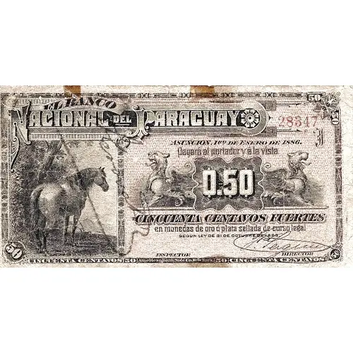 | Obverse lettering | EL BANCO NACIONAL DEL PARAGUAY ASUNCIÓN, 1ro. DE ENERO DE 1886 Pagará al portador y á la vista 0.50 CINCUENTA CENTAVOS FUERTES en monedas de oro ó plata sellada de curso legal segun ley de 31 de octubre 1883. (Translation: The National Bank of Paraguay Asunción, January 1st., 1886 Will pay to bearer, at sight, Fifty Centavos Fuertes in coins of gold or sealed silver, of legal tender, as Law from October 31st., 1883.) |