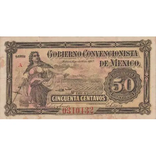 | Obverse lettering | GOBIERNO CONVENCIONISTA DE MEXICO Toluca Agosto 16 de 1915 CINQUENTA CENTAVOS 50 Vale al portador CINCUENTA CENTAVOS (Translation: Conventionist Government of Mexico Toluca, August 16, 1915 Fifty Cents Pay to the bearer Fifty Cents) |