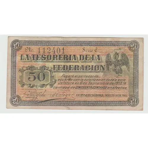 50 series C La Tesoreria de la Federacion Pagara al potador de acuerdo con la autorizacion dada a esta jefatura en el 6 de septiembre de 1913, la cantidad de Cincuenta Centavos en efectivo GUAYAMAS SONORA MARZO 16 DE 1914 |