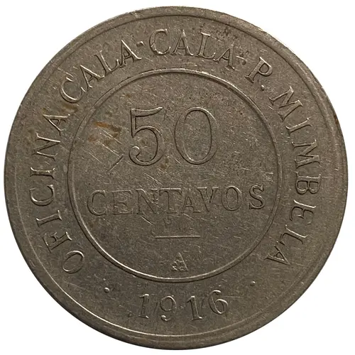 | Obverse lettering | Oficina Cala-Cala P. Mimbela $50 Centavos 1916 (Translation: Cala-Cala Office P. Mimbela 50 Cents) |