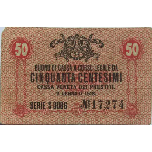 | Obverse lettering | Buono di Cassa a corso legale da CINQUANTA CENTESIMI Cassa Veneta dei Prestiti 2 Gennaio 1918 (Translation: Legal tender cash voucher from FIFTY CENTS Cassa Veneta dei Prestiti 2 January 1918) |