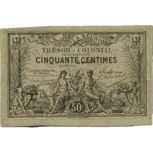 | Legenda do reverso | ÎLE DE LA RÉUNION CINQUANTE cent. La contre-valeur en espèces est déposée an Trésor TRÉSOR COLONIAL E. MOUCHON INVT & SCULPT (Translation: Island of Reunion Fifty cents The cash equivalent is deposited in the Treasury Colonial Treasury) |