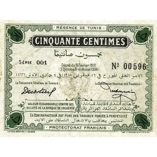REGENCE DE TUNIS CINQUANTE CENTIMES DÉCRET DE 16 FÉEVRIER 1918 5 DJOUMADI-EL-AOUAL 1336 VALEUR ÉCHANGEABLE CONTRE DES BILLETES DE LA BANQUE DE L`ALGÉRIE LE CONTREFACTEUR EST PUNI DES TRAVAUX FORCES A PERPÉTUITÉ PROTECTORAT FRANÇAIS LITHO & GRAVURE F. WEBER IMP. YVORRA BARLIER & CLAVÉ - TUNIS |
