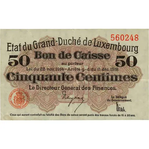 | Obverse lettering | Etat du Grand-Duche de Luxembourg Bon de Caisse Au Porteur Lei du 28 nov. 1914 - Arrete g. - d. du 11 dec.1918 50 Cinquante Centimes 50 Le Directeur General des Finances Ceux qui aurant contrefait ou falsife des Bons de caisse seront punis des travaux forces de 15 & 20 ans. (Translation: State of the Grand Duchy of Luxembourg Cash Voucher To bearer Law of November 28, 1914 - General Decree from December 11, 1918 Fifty Cents The Director-General of Finances / The Government Delegate Those who have counterfeited or falsified Cash Vouchers will be punished with forced labor for 15 to 20 years.) |